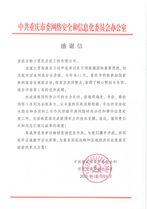 在2025年8月至11月国家级网络安全演练活动中,重庆贝特积极响应重庆市委网信办号召,选派周海龙、李松、蔡秋润三位技术骨干全程参与。他们凭借丰富的实战攻防经验、专业的安全技术能力与务实高效的工作作风,深度参与风险研判、应急处置及防御体系优化等关键任务,为重庆市最终实现“核心靶标0失陷、综合评估第1名”的优异成绩提供了有力技术支撑。周海龙同志更作为市级专家组成员全程参与指导,获得市委网信办特别致谢。