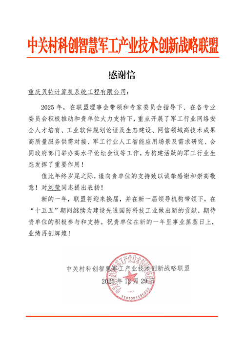 2025年,重庆贝特持续深化与中关村科创智慧军工产业技术创新战略联盟的合作,积极支持联盟在网络安全人才培养、工业软件规划论证、网信成果供需对接、人工智能应用场景研究等重点工作的开展。我司刘莹同志在相关工作推进中表现突出,获得联盟特别表扬。联盟在感谢信中表示,重庆贝特的参与为构建活跃的军工行业生态发挥了重要作用,期待未来继续携手,共同为建设先进国防科技工业贡献力量。
