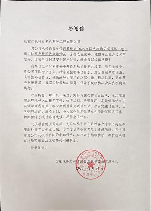 2026年1月,国家税务总局西藏自治区税务局信息中心发来感谢信,对我司承接的“西藏税务2025年防火墙购买项目”给予高度评价。面对西藏高原低温、高海拔的特殊环境,我司李绍勇、申一帆、柴浩、刘杨为核心的项目团队主动克服环境不便,恪守工期、严谨履职,提供的防火墙产品适配性强、稳定性高,高效解决系统兼容、数据防护等核心问题,保障了税收核心业务安全稳定运行。团队的专业务实、响应迅速、服务周到,赢得了客户的高度信赖。