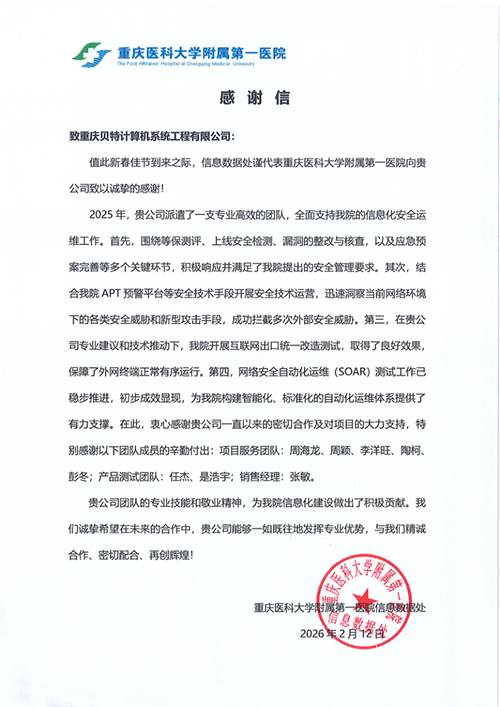 重庆医科大学附属第一医院连续两年发来感谢信。2025年春节前夕,院方对我司程必磊、陶柯、李洋旺、刘升松等服务团队在等保测评、外网攻击安全研判、漏洞整改核查、应急预案完善等方面的突出表现给予肯定;结合APT预警平台开展安全技术运营,成功拦截多次外部安全威胁,并在域名访问改造方面取得良好成效。2026年新春之际,院方再次致谢,特别提到我司团队在互联网出口统一改造、网络安全自动化运维(SOAR)测试等工作中稳步推进,为医院构建智能化、标准化的运维体系提供了有力支撑。周海龙、周颖、李洋旺、陶柯、彭冬等服务团队,任杰、是浩宇等产品测试团队,以及销售经理张敏的专业协作获得院方高度认可。